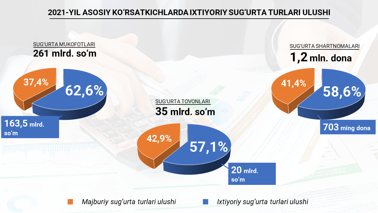 Misol uchun, 2021-yilda jami 261 milliard soʻmlik sugʻurta mukofoti taʼminlangan boʻlsa, shundan 163,5 milliard soʻmi ihtiyoriy sugʻurta shartnomalari yuzasidan amalga oshirilgan.